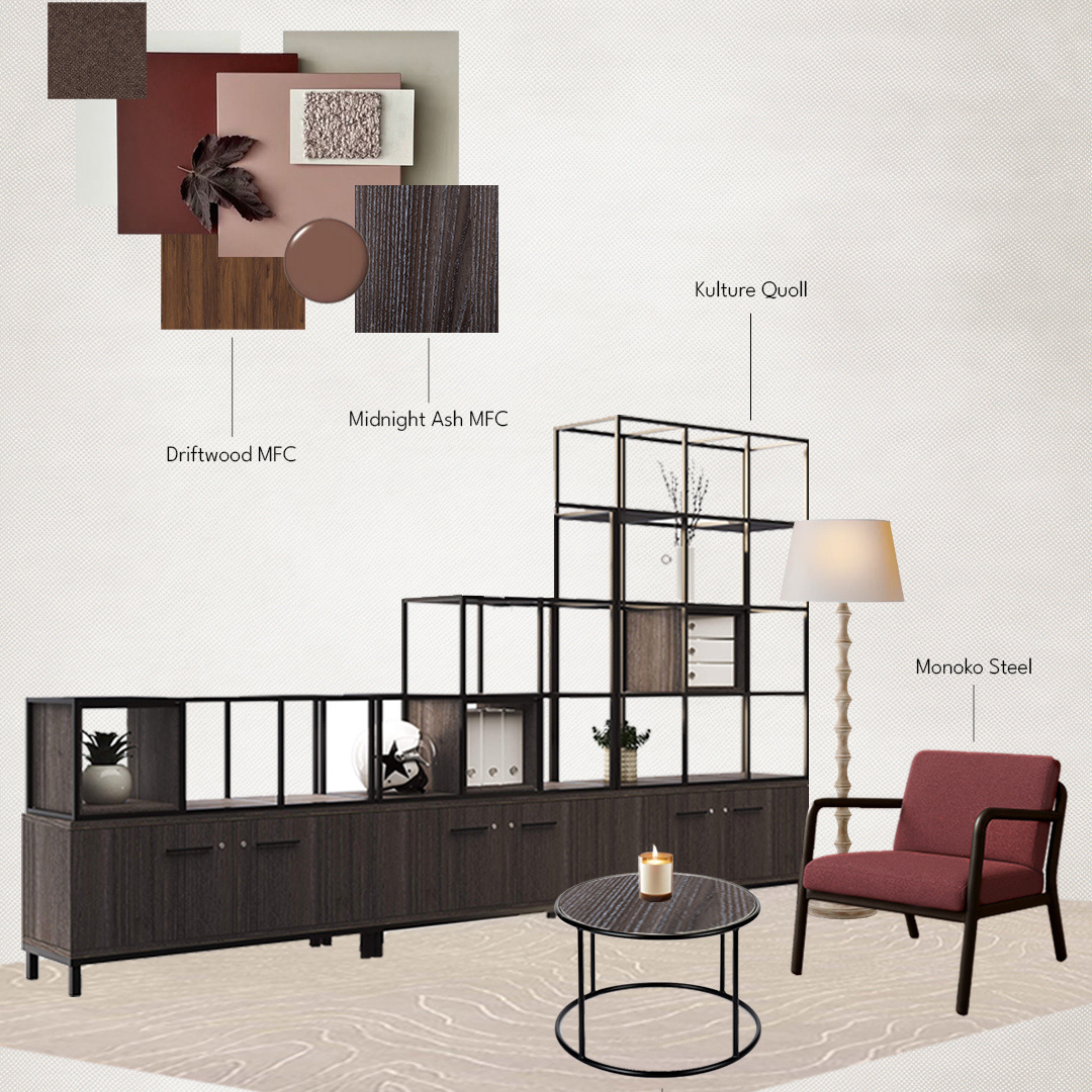 Having light, contrasting soft finishes such as sheer curtains or an oversized rug paired with warm lighting is a way of not letting dark woods feel overpowering. In an office environment this can be demonstrated in a breakout or lounge space.